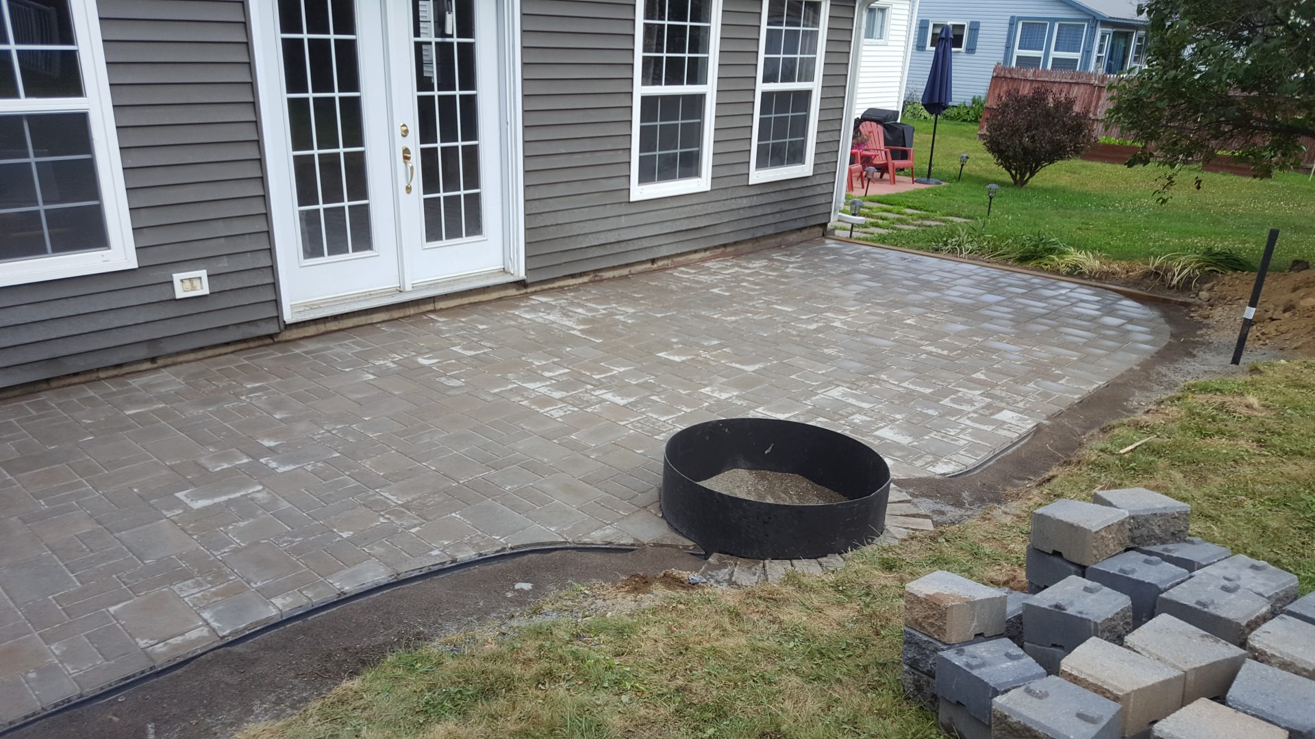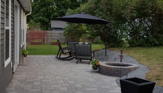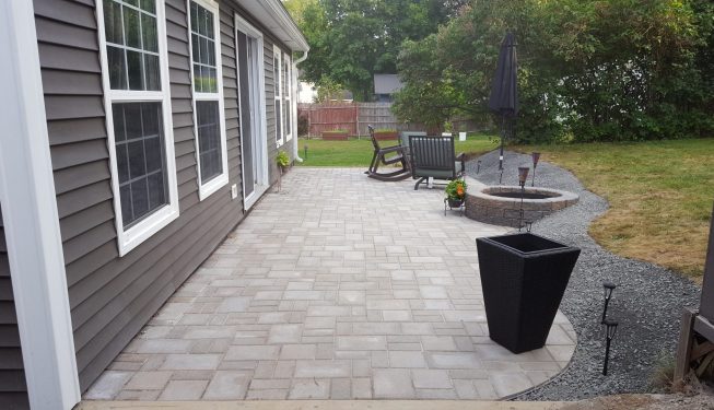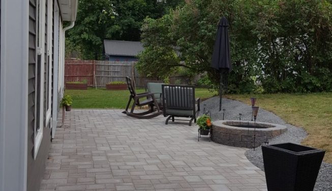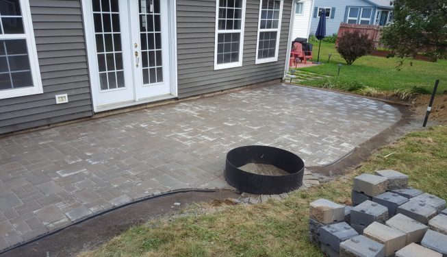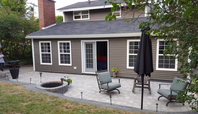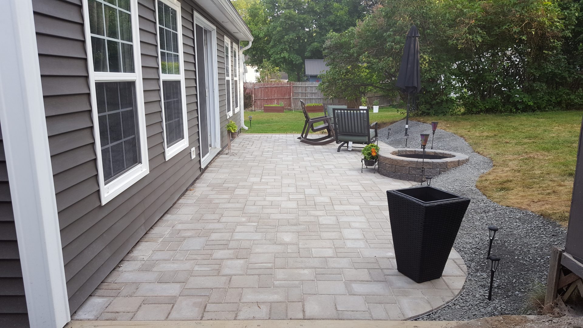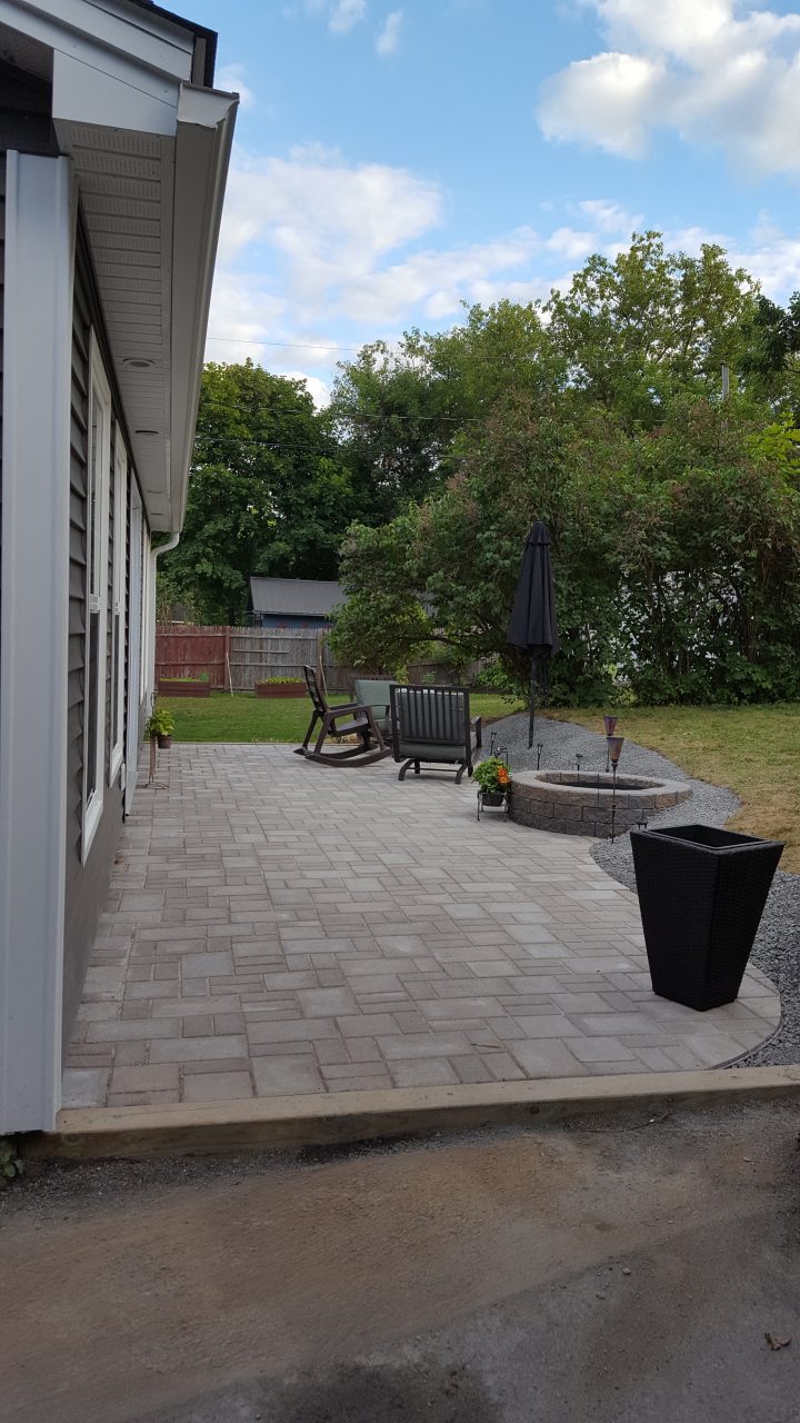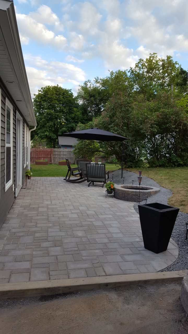 Time for the old deck to go. The home owner was in need of a backyard update. Clarkview installed a new paver deck pad which extended to the full length of the back of the house. This allowed for a large area for chairs and umbrella. The fire pit that was installed is half embedded into the upward slope of the back lawn. Curves were implemented along the edge of the paver pad to help with the transition between the pad, fire pit and slope of the back yard.