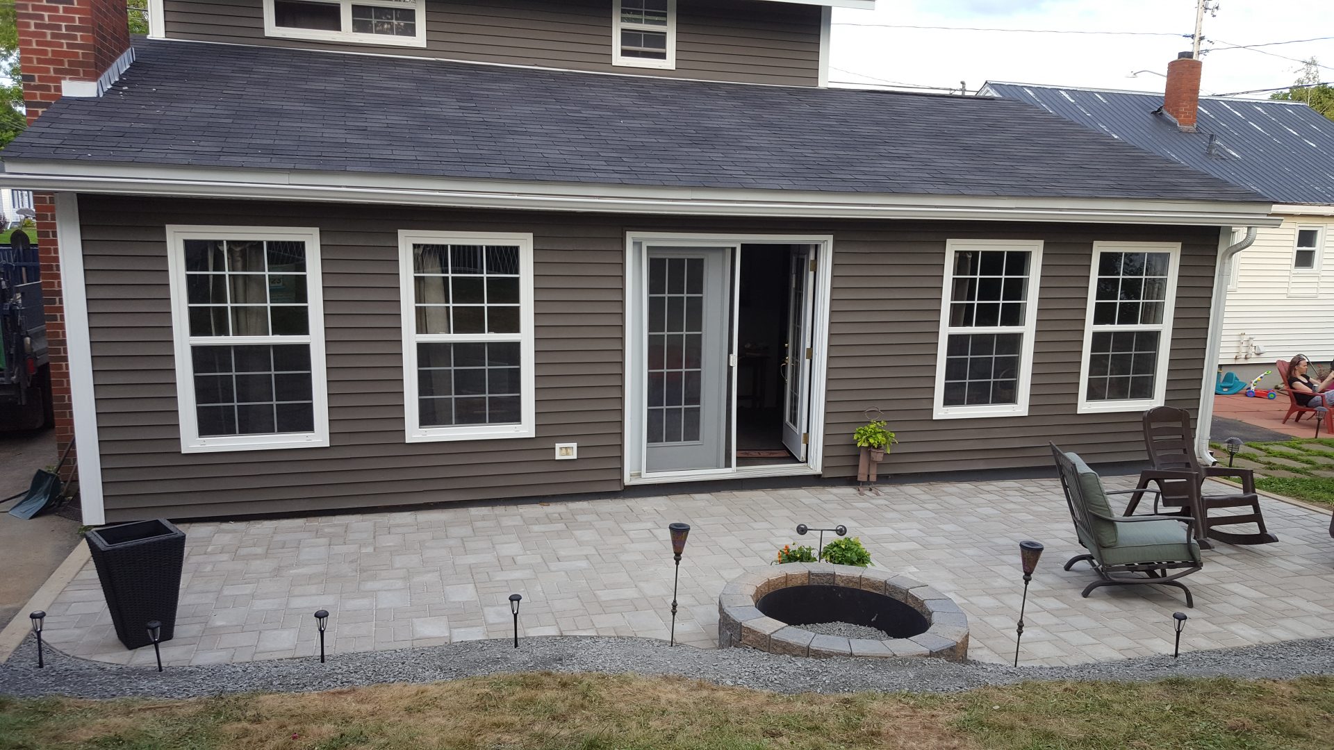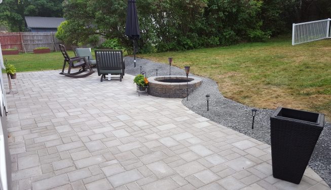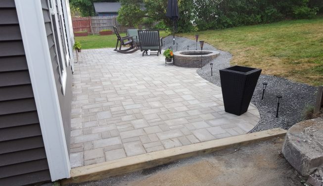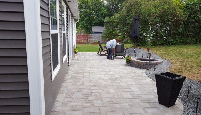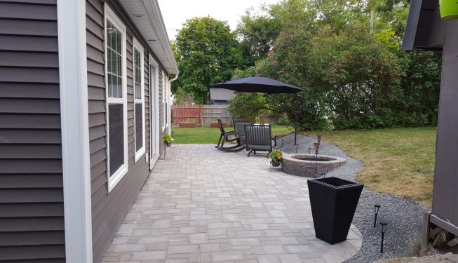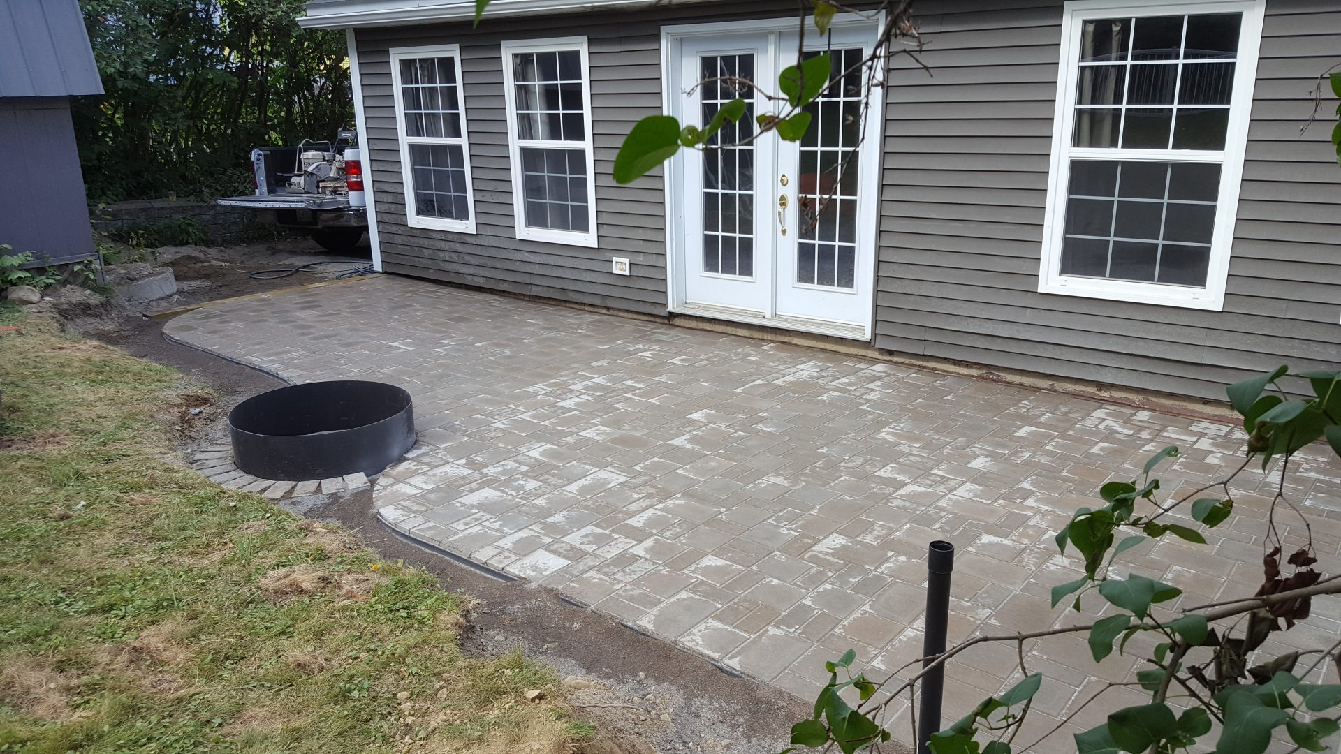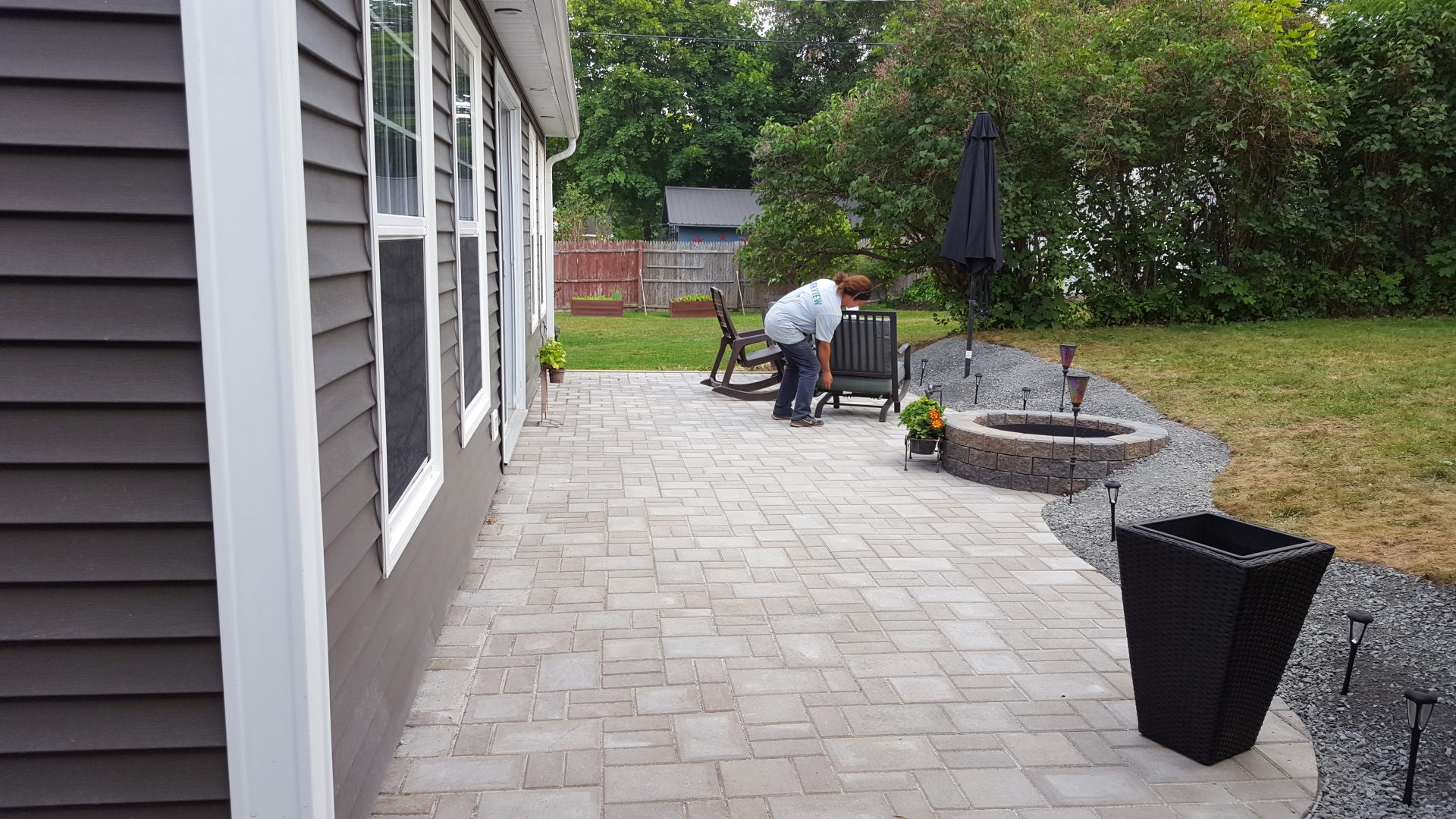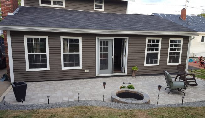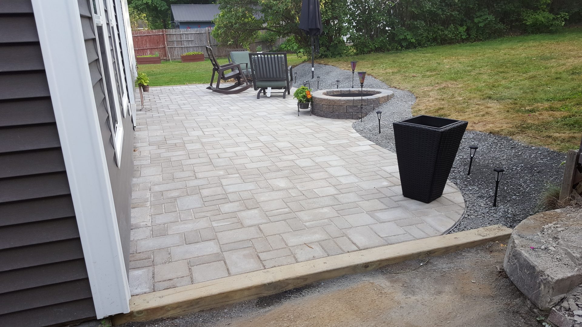 Time for the old deck to go. The home owner was in need of a backyard update. Clarkview installed a new paver deck pad which extended to the full length of the back of the house. This allowed for a large area for chairs and umbrella. The fire pit that was installed is half embedded into the upward slope of the back lawn. Curves were implemented along the edge of the paver pad to help with the transition between the pad, fire pit and slope of the back yard.