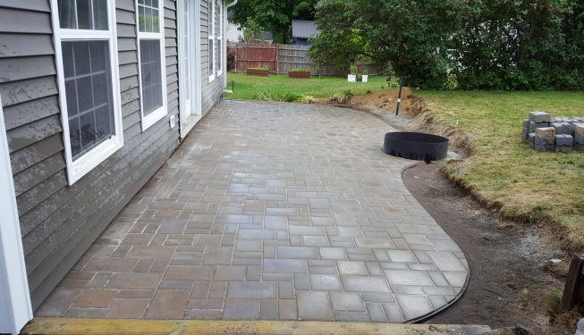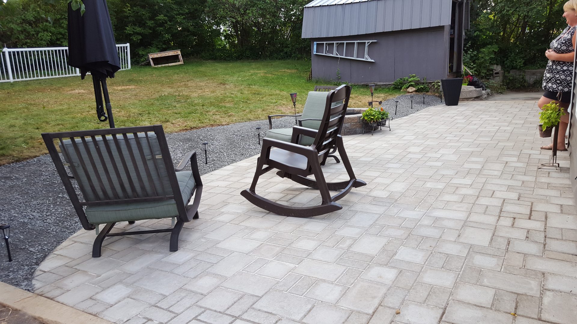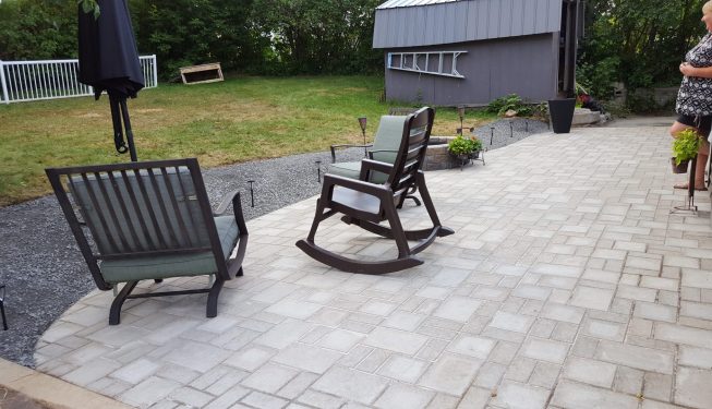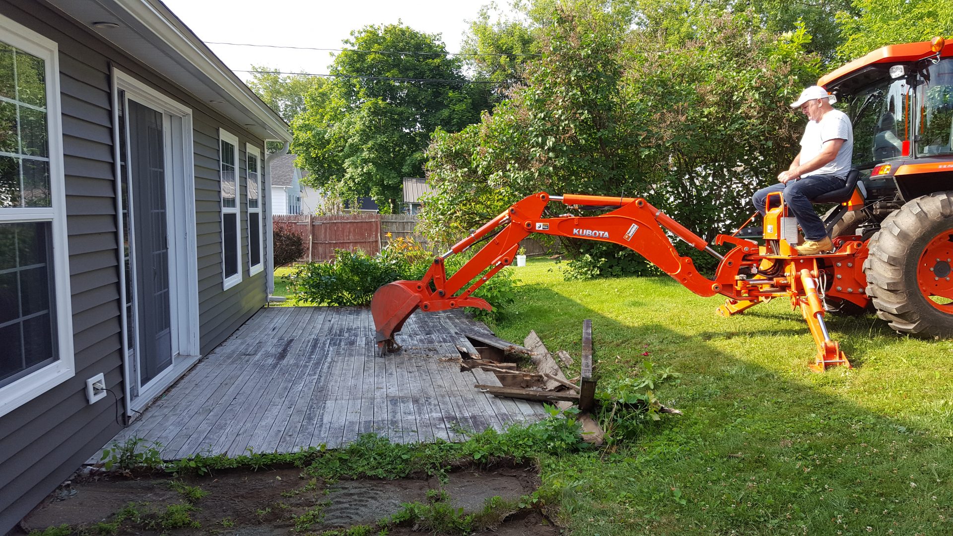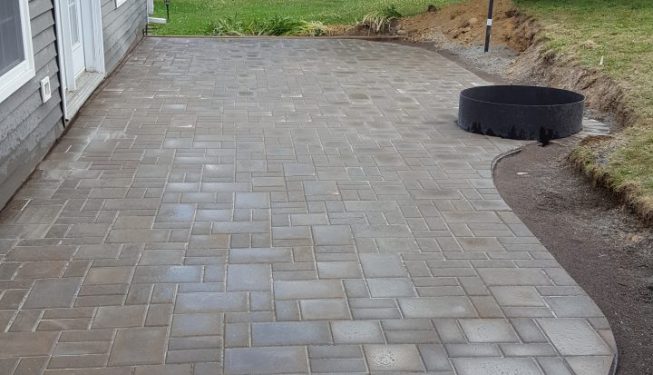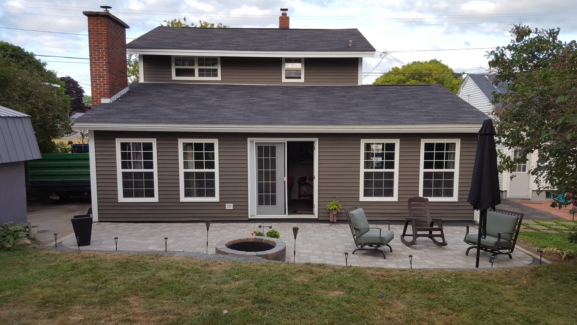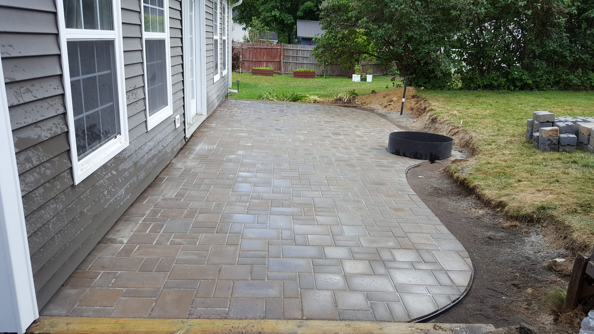 Time for the old deck to go. The home owner was in need of a backyard update. Clarkview installed a new paver deck pad which extended to the full length of the back of the house. This allowed for a large area for chairs and umbrella. The fire pit that was installed is half embedded into the upward slope of the back lawn. Curves were implemented along the edge of the paver pad to help with the transition between the pad, fire pit and slope of the back yard.