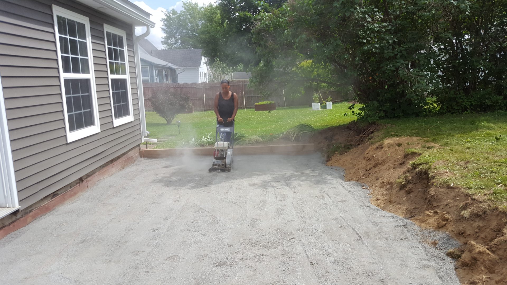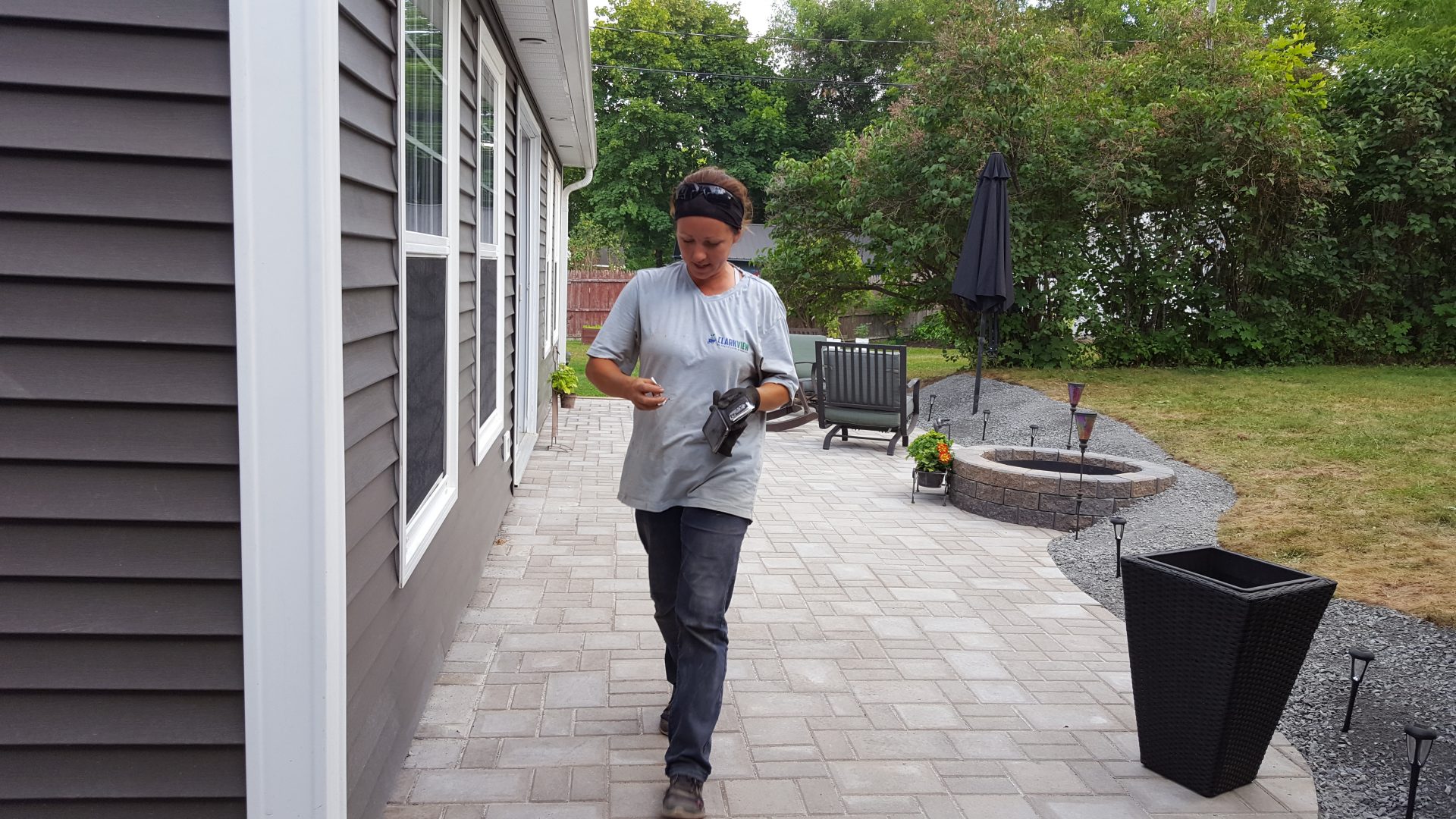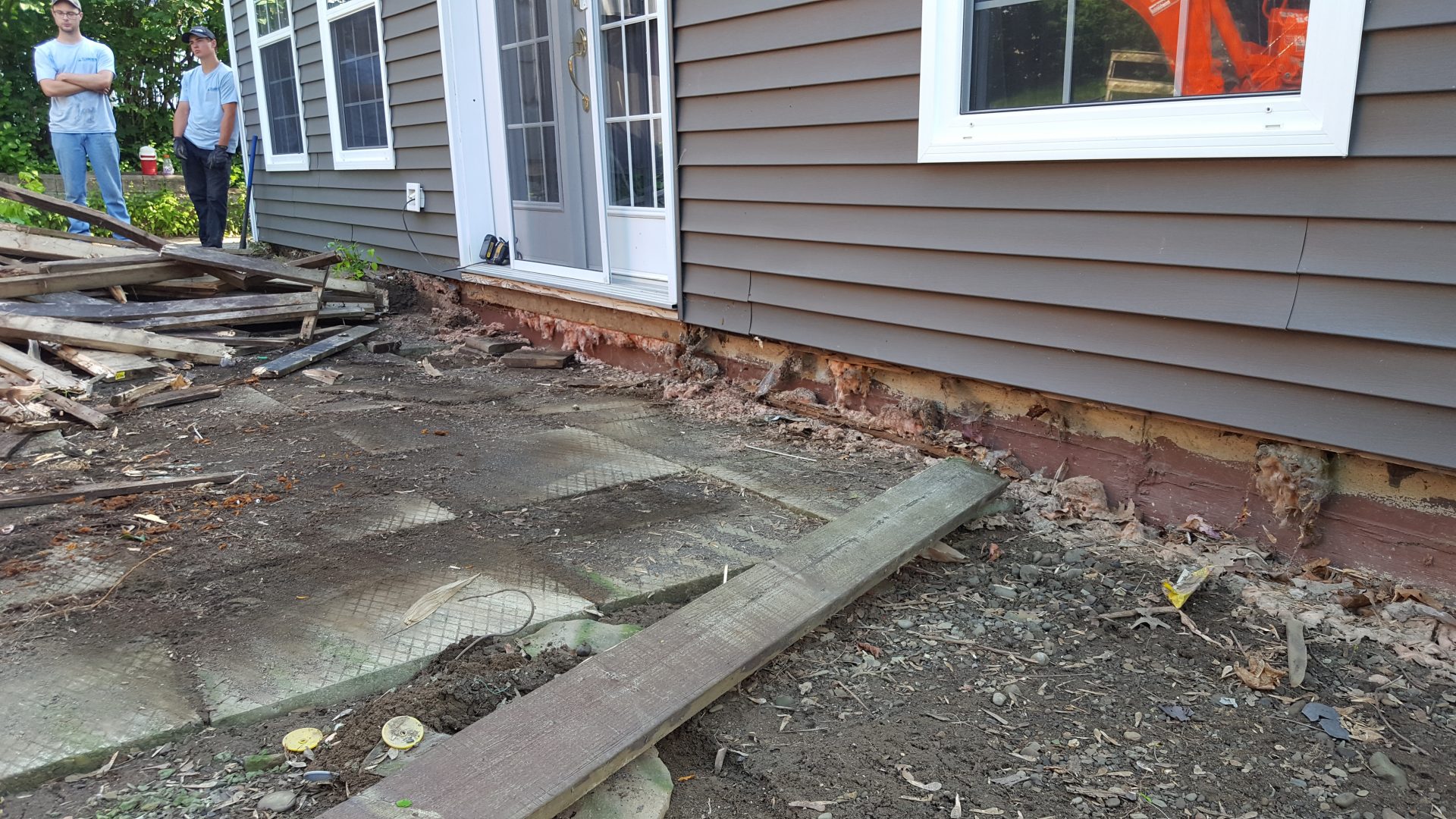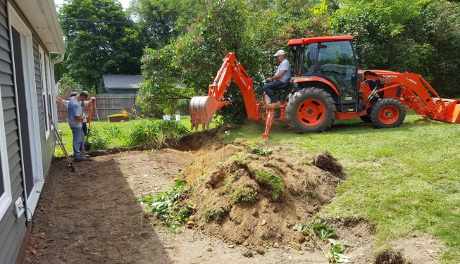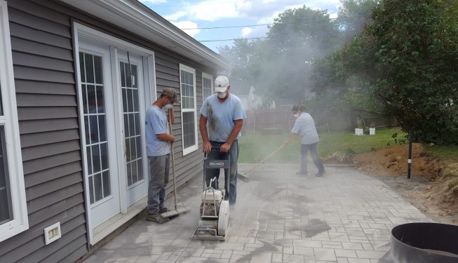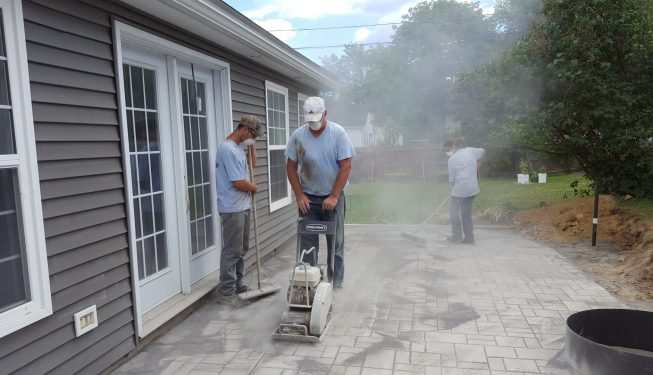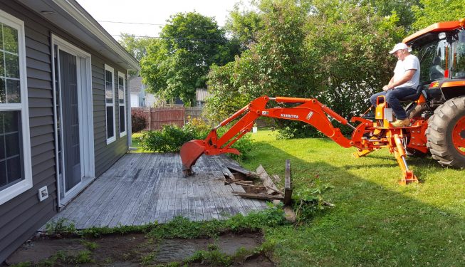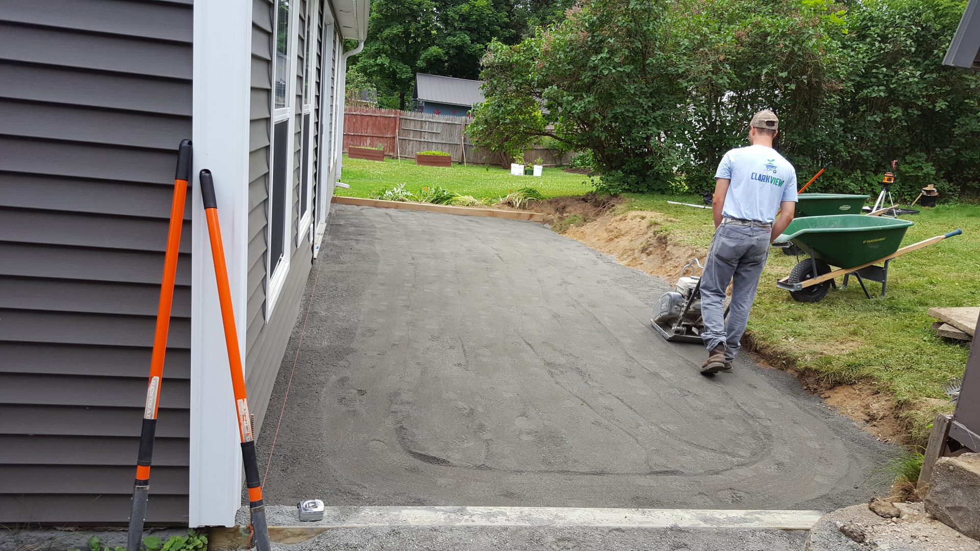 Time for the old deck to go. The home owner was in need of a backyard update. Clarkview installed a new paver deck pad which extended to the full length of the back of the house. This allowed for a large area for chairs and umbrella. The fire pit that was installed is half embedded into the upward slope of the back lawn. Curves were implemented along the edge of the paver pad to help with the transition between the pad, fire pit and slope of the back yard.